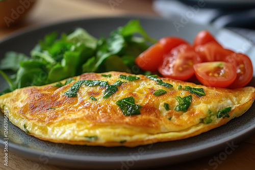Golden omelet with fresh herbs and cherry tomatoes on a black plate