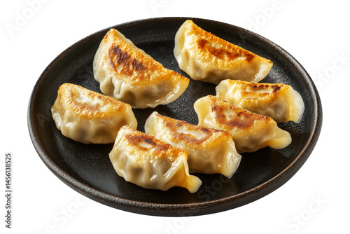 Golden pan-fried Japanese gyoza dumplings served on ceramic plate, isolated on white transparent background, concept of Asian cuisine