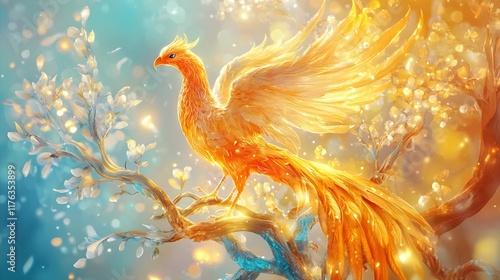 graceful, magical, serenity, calmness, fairy tale, hope, sparkle, majestic, wing, peace, painting, glowing, fantasy, vibrant, artwork, feather, freedom, power, elegant, phoenix, mythical, digital artwork, gold, illustration, light, bird, art, flower, colourful, nature, spring, tree, beautiful, tree branch, blossom
