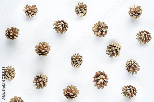 golden pine cone pattern background isolated on white for Christmas or winter seasonal