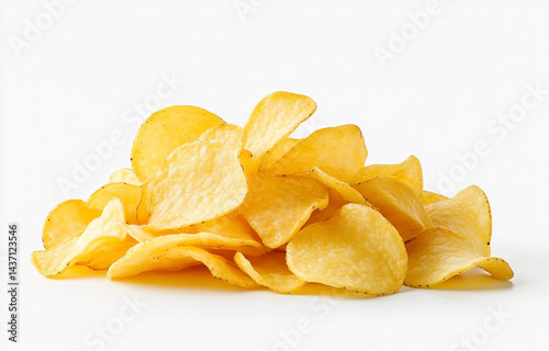 Golden potato chips in a heap, studio shot on white background, snack food