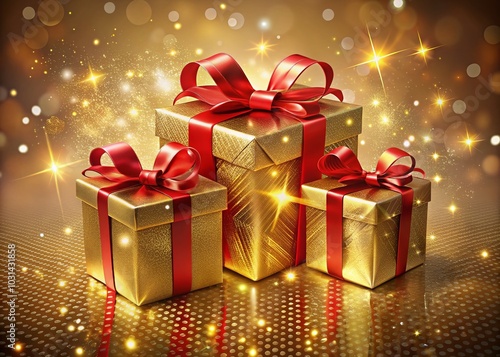 Golden Presents with Red Bow for Sinterklaas, Christmas, Weddings, and Celebrations | 3D Render Illustration