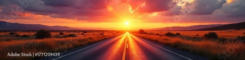 Golden rays illuminate a tranquil road stretching towards a vibrant sunrise, painting the sky with breathtaking hues Perfect for travel, nature, and inspirational themes , sky, background, wallpaper