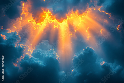 cloud, sky, sun, ray, light, storm, dramatic, sunset, sunrise, atmosphere, weather, heaven, divine, majestic, powerful, gold, orange, yellow, blue, dark, deep, moody, mystical, aethereal, vibrant, intense, beauty, nature, wonder, awe, hope, faith, spiritual, energy, illumination, radiant, beam, picturesque, spectacular, breathtaking, cloudscape, heavenly