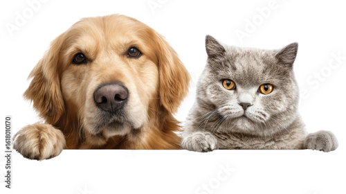 Golden retriever and gray cat looking curiously, isolated on white background.
