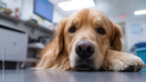 dog, gold, retriever, pet, animal, vet, veterinary, clinic, doctor, health care, medicals, care, treatment, medicine, health, canino, fur, eye, nose, paw, tail, tongue, teeth, puppy, doggy, companion, friends, loyal, cute, adorable, domestic, mammal, portrait, closeup, indoor, floor, table, equipment, waiting, patient, calm, worried, nervous