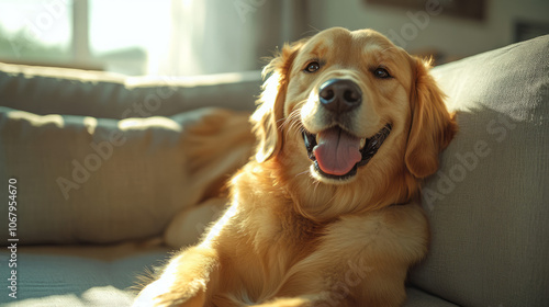 Golden Retriever Cuddling on the Couch: A Heartwarming Portrait of a Happy Companion