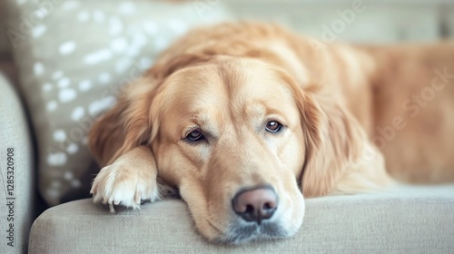 Golden Retriever Dog Looking Sad and Relaxed on Couch with Soft Furnishings : Generative AI
