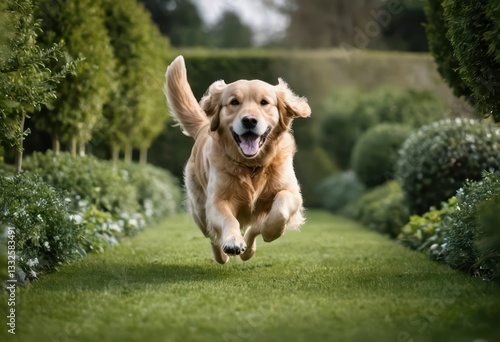 golden retriever dog running in a garden, doggy playing in the green