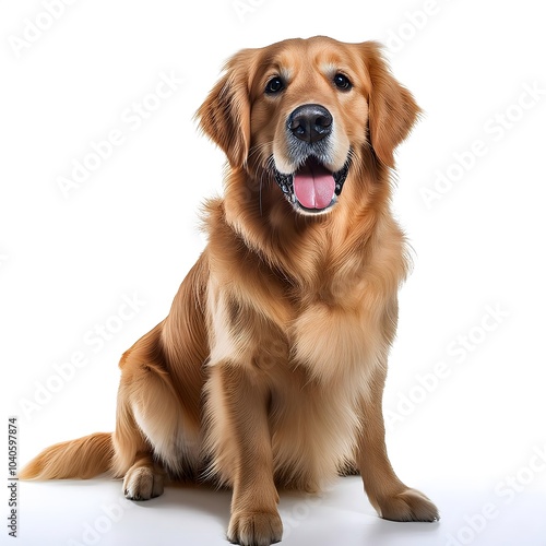 Golden Retriever dog sitting on a white background, looking happy and friendly with a wagging tail