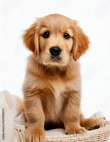 Golden retriever puppy close up on white backdrop.