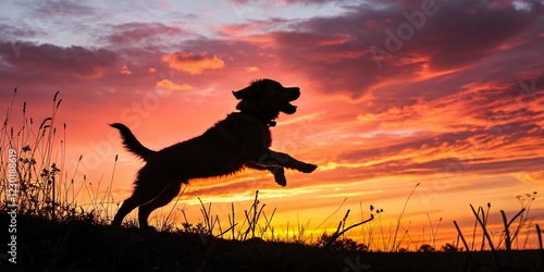 silhouette, jumping, dog, puppy, sunset, golden retriever, playful, happy, energetic, pet, canino, animal, dynamic, energy, movement, fun, cute, adorable, gold, retriever, animal portrait, jump