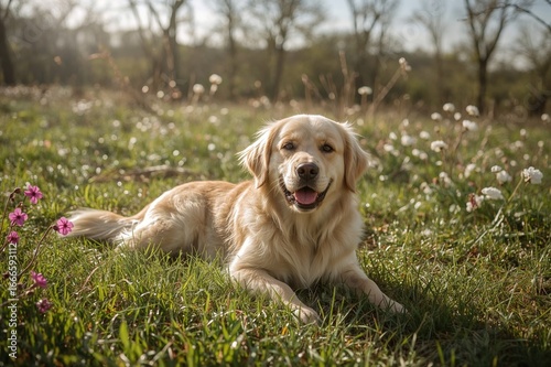 grass, nature, spring, happy, green, animal, cute, park, dog, pet, fun, freedom, plant, golden retriever, outdoors, hound, laugh, lying down, no one, outskirts, rest