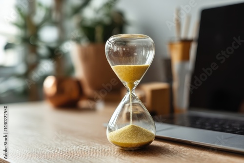 Golden sand hourglass on wooden desk beside a laptop symbolizing time deadline and efficiency work from home