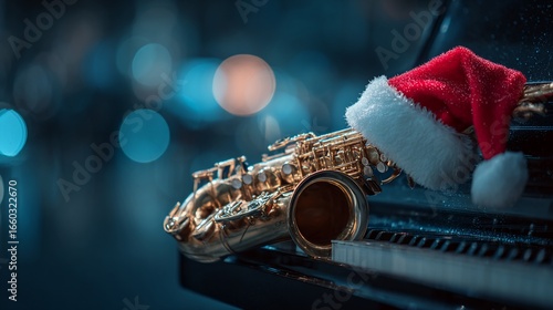 Golden Saxophone with Santa Hat Resting on Piano in Festive Holiday Scene