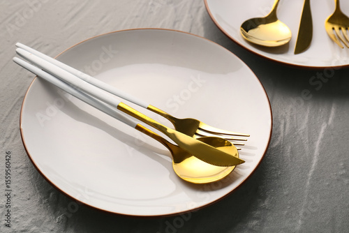 cutlery, gold, grey, plate, set, table, white, background, clean, closeup, colours, decor, design, dining, dinner, dinnerware, crockery, domestic, eat, flatware, food, fork, handle, kitchen, kitchen utensile, knife, lunch, meal, metal, modern, new, nobody, object, eatery, serving, setting, silverware, spoon, stainless, steel, style, stylish, tableware, tool, utensil