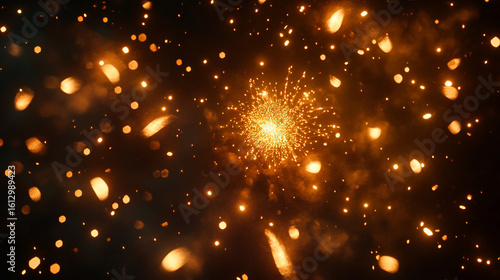 Golden sparks burst across dark background glowing brightly like fireworks