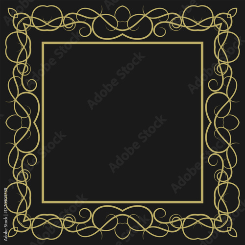 Golden square vintage frame on black background. Graceful arabesques and border. Version 13. Vector illustration