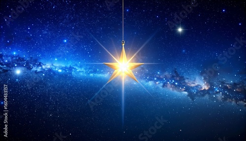 Golden star hanging in night sky, galaxy background