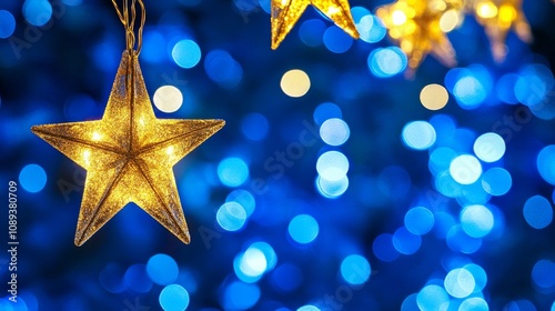 Golden Star with Blue Bokeh Lights, christmas ,holiday