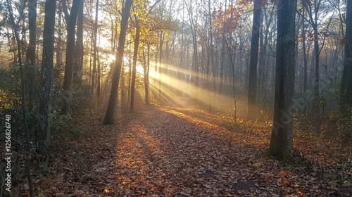 gold, sun, ray, piercing, treetop, casting, light, nature, forest, autumn, tree, pathway, sunlight, leaf, scenery, tranquil, peaceful, brightness, shadow, wood, landscape, sky, beam, morning, mist, environment, natural