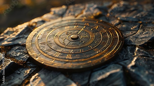 Golden sundial on textured stone surface with warm sunlight casting shadows - buy now for timeless photography inspiration!