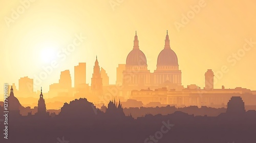 sunrise, city landscape, silhouette, dome, twin, tower, building, city, urban, skyline, gold, yellow, orange, hazy, sun, light, morning, architecture, structure, landscape, view, horizon, background, scene, image, picture, photograph, metropolitan, metropolis, modern, historical, church, cathedral, england, london, landmark, iconic, beauty, aesthetic, art, design, illustration, graphic