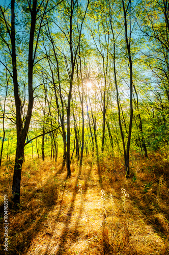 Golden sunrise in the forest , morning autumn time . Beautiful landscape with trees . Woodlands in orange colors . Sunrise over the forest . Green grass and leaves , blue sky . Autumn nature