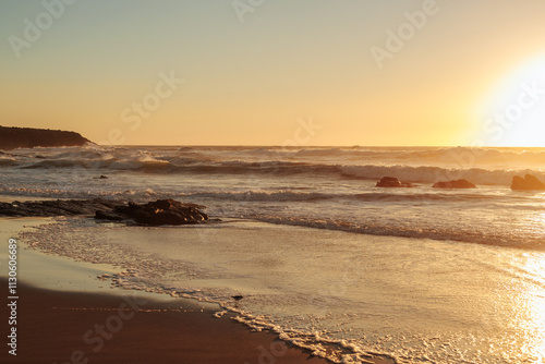 sunset, beach, ocean, wave, crashing, gold, hours, seascape, sand, nature, coastline, landscape, sea, shore, water, dusk, evening, sunlight, orange, yellow, scenic, tranquil, serene, peaceful, beautiful, travel, vacation, destination, summer, coast, rock, tide, foam, outdoors, horizon, sky, sun, light, colours, vibrant, warm, picturesque, idylli