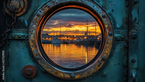 Golden Sunset over Harbor: Boats at Dusk, Viewed Through Rusty Porthole, Serene Evening Seascape