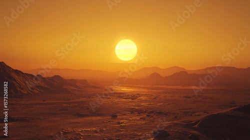 Golden sunset over mars landscape with mountains and desert planet surface stock photo download silhouette