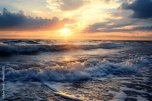 sunset, ocean, wave, sea, gold, horizon, sky, cloud, water, nature, beach, landscape, background, beautiful, scenic, calmness, calm, peaceful, relaxation, travel, vacation, summer, evening, dusk, sunrise, day, light, colours, vibrant, soft, dramatic, majestic, photo