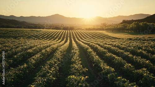 sunset, sunrise, gold, warm, rural, farm, field, agriculture, row, green, landscape, nature, country, light, sun, sky, morning, evening, tranquil, peaceful, serene, countryside, horizon, hill, vinery, fruit farm, tree, grass, bush, meadow, grove, farmland, growth, plant, foliage, crop, ground, dirtied, dirt, texture, pattern, background
