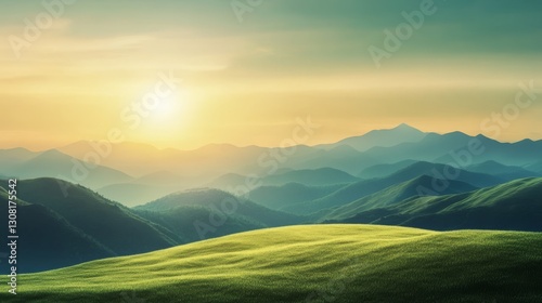 Golden sunset over serene green mountains, a breathtaking landscape