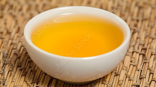 Golden Tea in White Bowl on Woven Mat