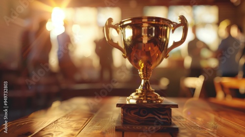 Golden trophy award. Gold trophy cup on wooden table with blurry background of celebrating people. Achievement, success, prize, victory, and honor.
