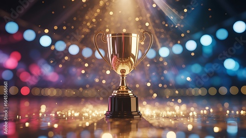 Golden Trophy Gleaming Under Spotlight Celebrating Victory Among Blurred Lights Evoking Achievement Awards and Success Recognition