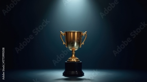 Golden trophy illuminated by spotlight on dark background