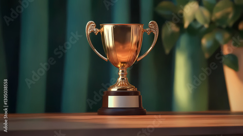 Golden Trophy on Wooden Table with Green Curtains