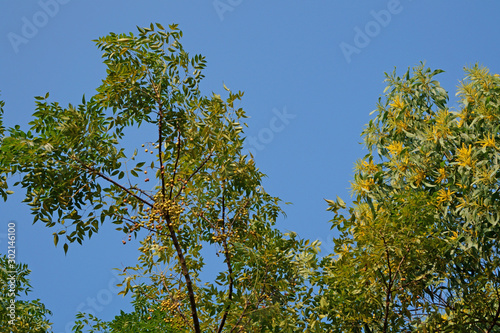Golden wattle and chinaberry tree with blue sky