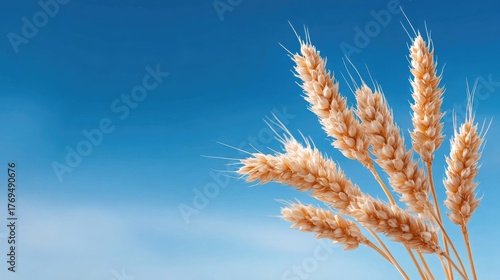 Golden Wheat Ears Against a Clear Blue Sky, Symbolizing Agriculture, Harvest, Summer, and Nature's Bounty in a Serene Outdoor Landscape