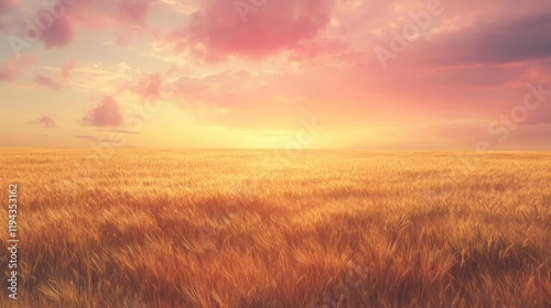Golden wheat field illuminated by a stunning sunset with vibrant colors and dramatic clouds creating a serene countryside landscape.