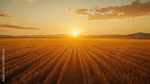 sunset, sunrise, gold, wheat, field, agriculture, farm, rural, landscape, nature, sky, cloud, hill, mountain, horizon, scenery, country, agrarian, harvest, summer, autumn, yellow, orange, light, ray, sun, day, evening, tranquil, peaceful, serene, beauty, huge, expansive, outdoors, picturesque, scenic, background, texture