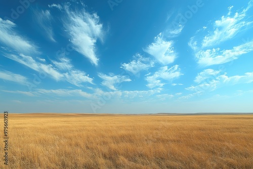 sky, blue, cloud, cirrus, white, field, wheat, gold, grass, horizon, landscape, nature, summer, day, rural, countryside, outdoors, agriculture, farm, harvest, grain, dry, brown, green, yellow, sunlight, sunshine, bright, clear, huge, open, wide, distant, scenic, beautiful, tranquil, peaceful