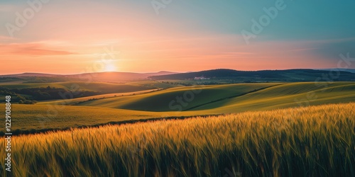 Golden wheat fields under vibrant sunset sky, rolling hills, serene landscape, warm colors, peaceful countryside, nature's beauty