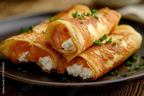 Golden-brown crepes delicately rolled with creamy cottage cheese and silky smoked salmon. An exquisite gourmet dish served on a rustic plate, perfect for an indulgent brunch.
