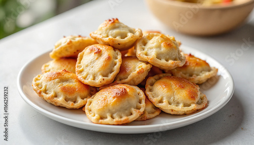Golden-brown mini pastries stacked on a white plate, exuding warmth and inviting comfort, representing the concept of International Tapas, with a blurred background of colorful bowls