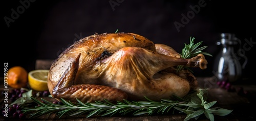Golden-brown roasted turkey, elegantly garnished with fresh herbs, symbolizing a warm gathering and festive celebration. Delicious!