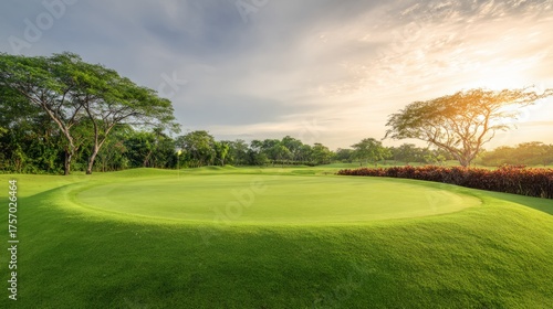 golf. Ancient golf course green glowing in morning light, manicured grass surface. event key visuals, club posters, designed for fitness apps and gym onboarding, used by fitness trainers.