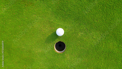 Golf ball green grass overhead view putting hole sport competition precision outdoor recreation. Aerial shot of white golf ball near hole vibrant green putting surface evoking focus